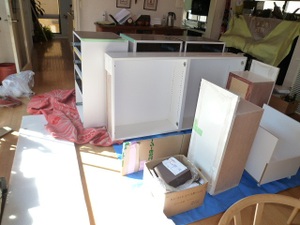 ちょうど吊戸棚の箱を取り付けるところでした。箱が取り付いたら今度は扉・引き出しの取り付け・調整です。星原さんはゴミ箱用キャスターワゴンの部分を加工しています。