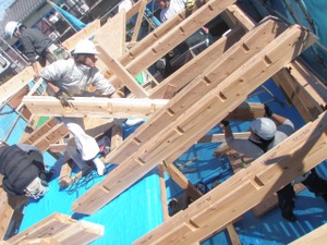 棟梁の秀さんと一緒にこの現場を施工するたける君が、上がった登り梁を納める場所に配っています。