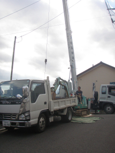 土地が前面道路よりも4m近く下がっているので、砕石をクレーン車で降ろします。
