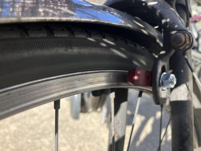 ブレーキシューの交換を怠り、シューが削れ、金属部分がリムに触れ。リムが傷だらけになり、
