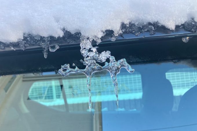 雪が降った翌日、車のドアバイザーにできたつらら。