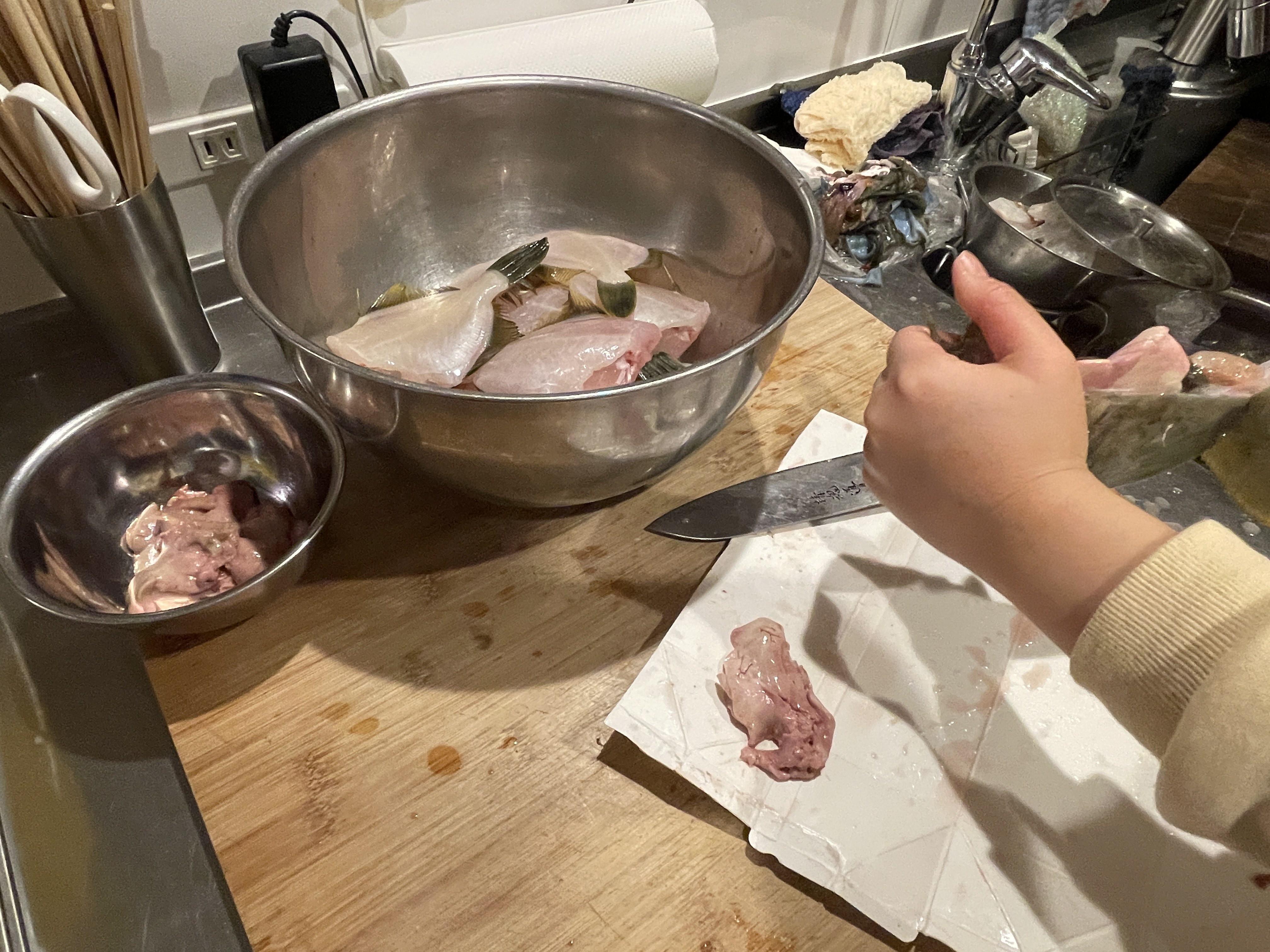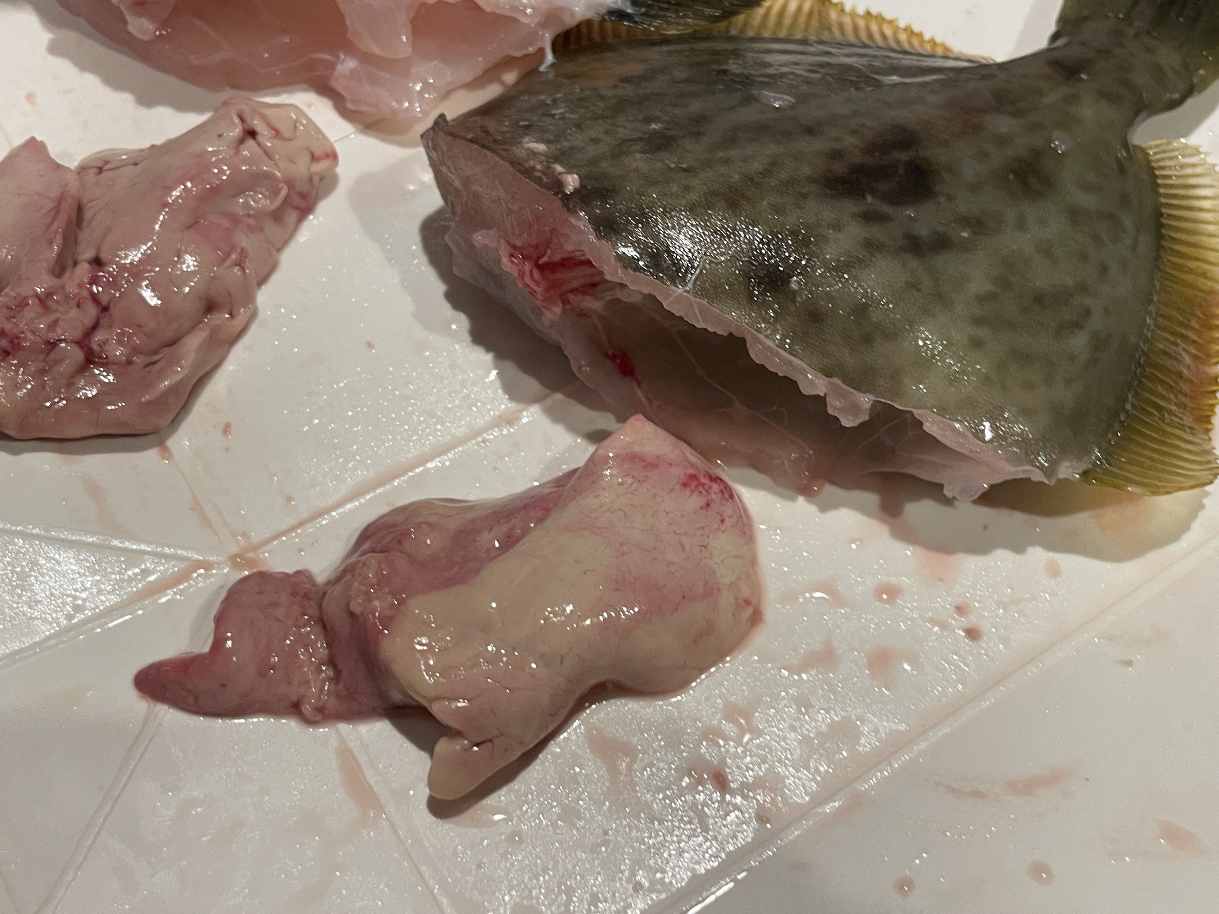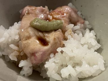 肝が余ったのでご飯の上に乗せて、ワサビと醤油で「カワハギの肝丼」!