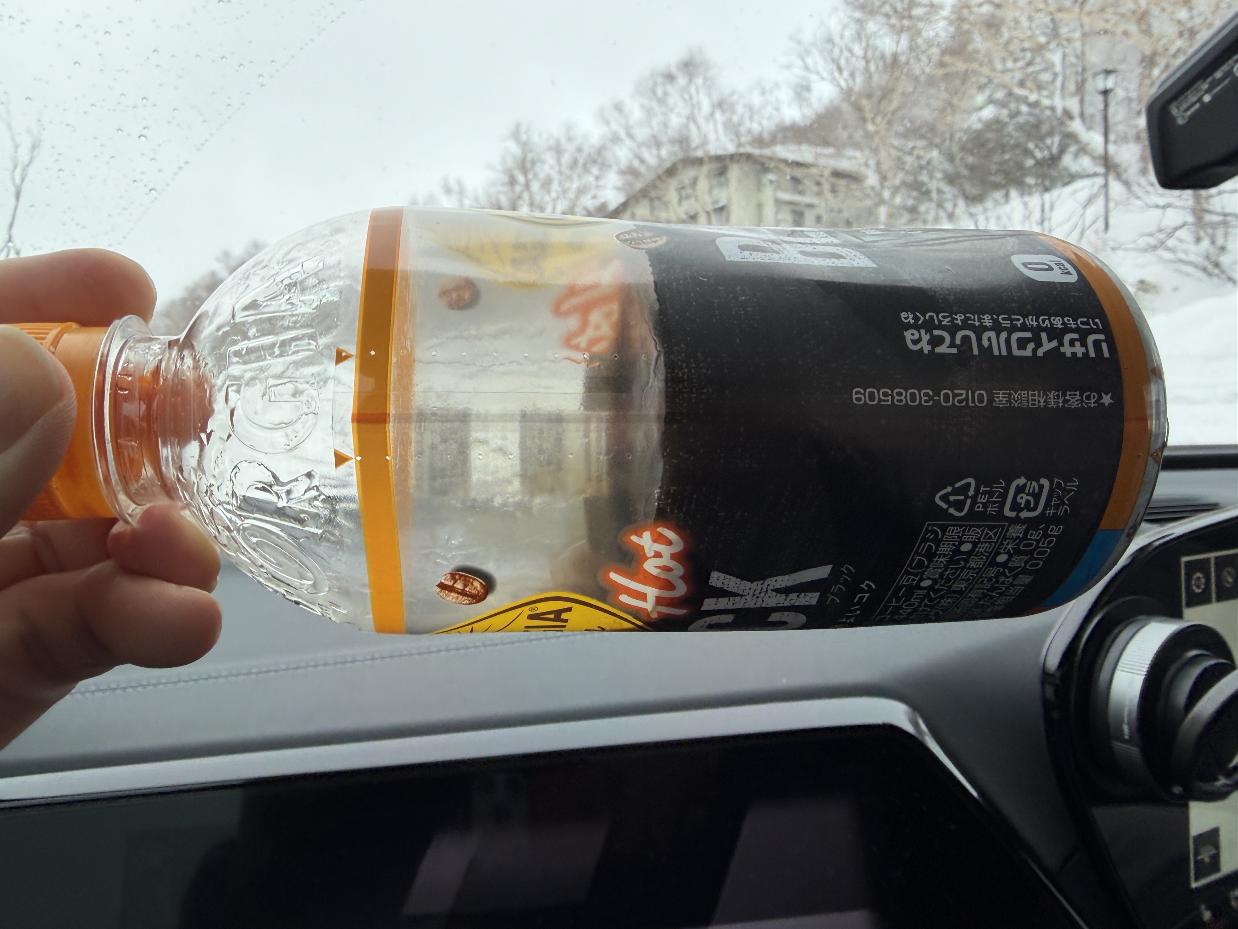 車の中に置いておいたコーヒーのペットポトルはカチンコチンに凍ってました。