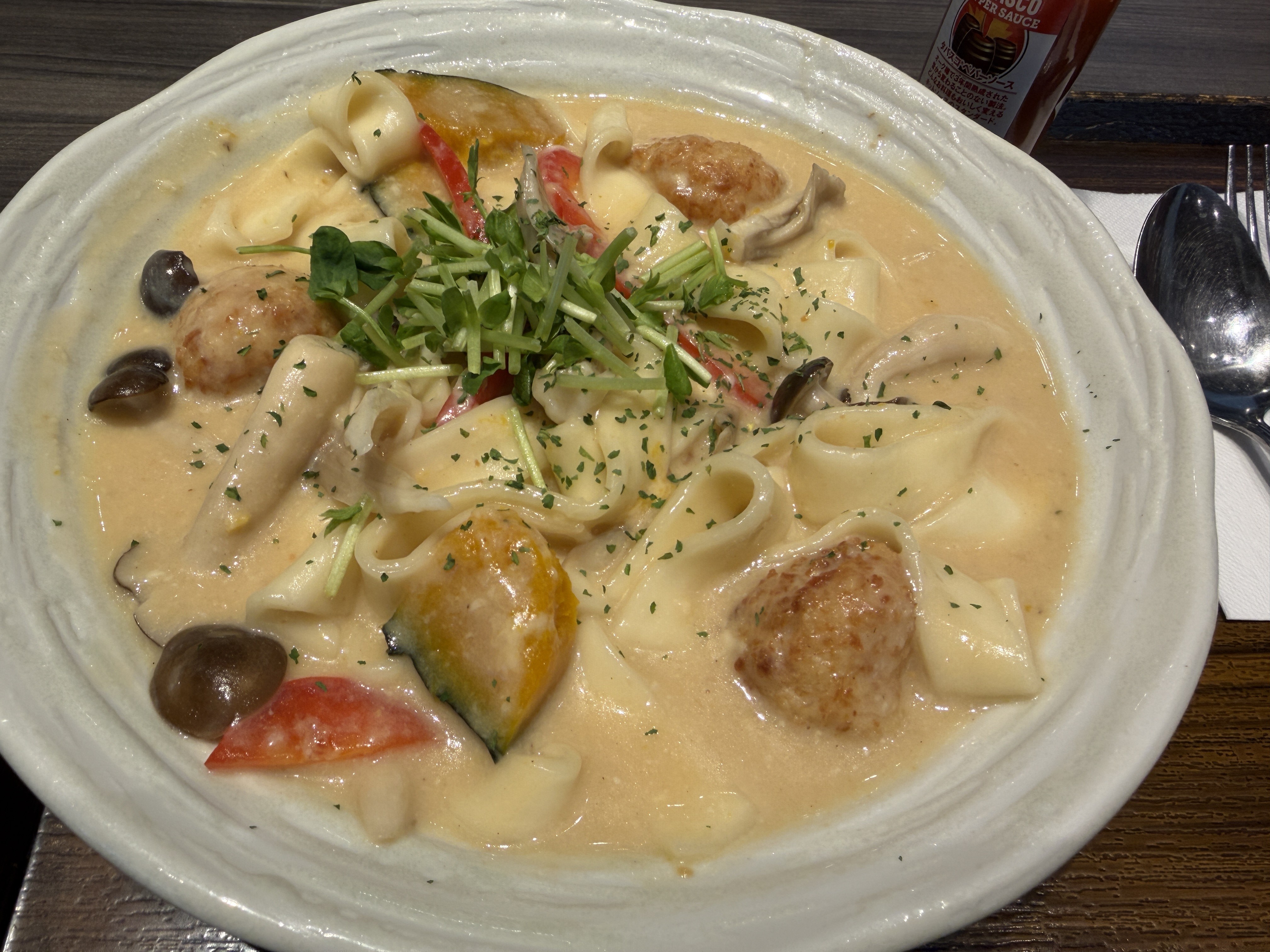 帰り道のお昼は、カルボナーラ味の「甲州味噌ボナーラ」。
